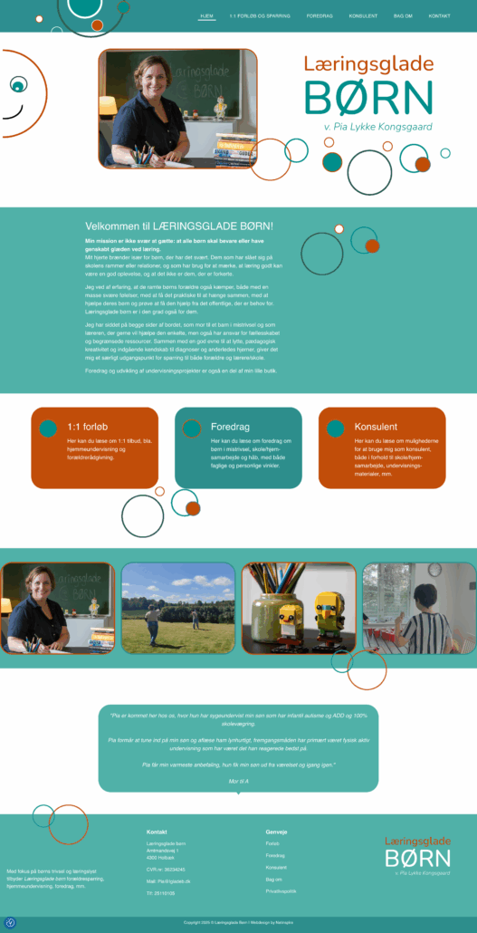 I samarbejde med Malene Netinspire har jeg fået en hjemmeside, som ikke kun udstråler seriøsitet og livsglæde men som også er informativ og super enkel at navigere rundt i. En hjemmeside i et flot design og smukke farver.Foruden at indfri alle mine ønsker til selve hjemmesidens udformning, så overraskede Malene med flotte detaljer i form af logo og ikoner. Jeg havde slet ikke forestillet mig, det kunne blive så godt.